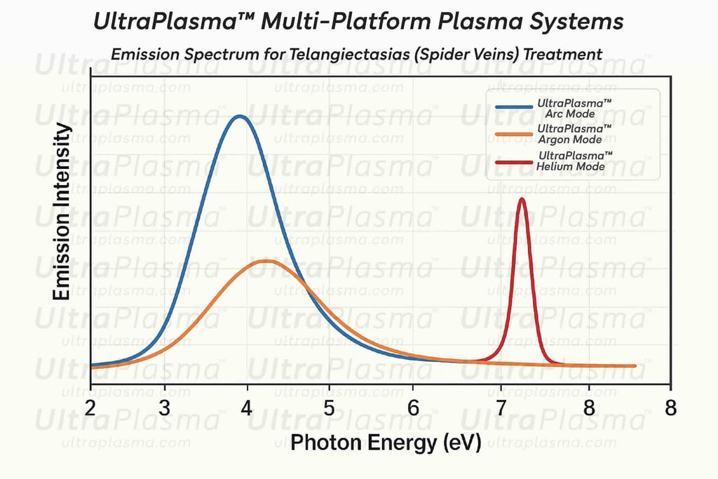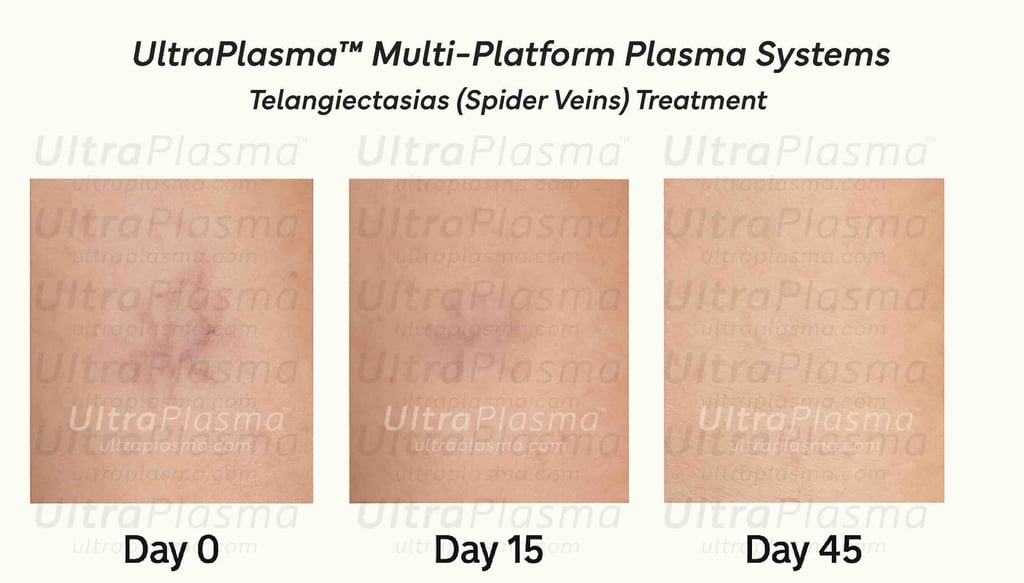 Telangiectasias, commonly known as spider veins, are dilated superficial blood vessels predominantly located within the dermis. Although benign, they present significant aesthetic concerns. Emerging plasma-based therapies offer promising minimally invasive solutions. This article explores the application of the UltraPlasma™ multi-platform system, utilizing arc plasma, argon plasma, and helium plasma technologies. We detail the mechanisms at the epidermis, dermis, and hypodermis levels, emphasizing the roles of ozone, nitric oxide (NO), and reactive oxygen and nitrogen species (RONS) in vascular remodeling, endothelial targeting, and skin rejuvenation. Illustrations and clinical imaging support the understanding of treatment dynamics.
